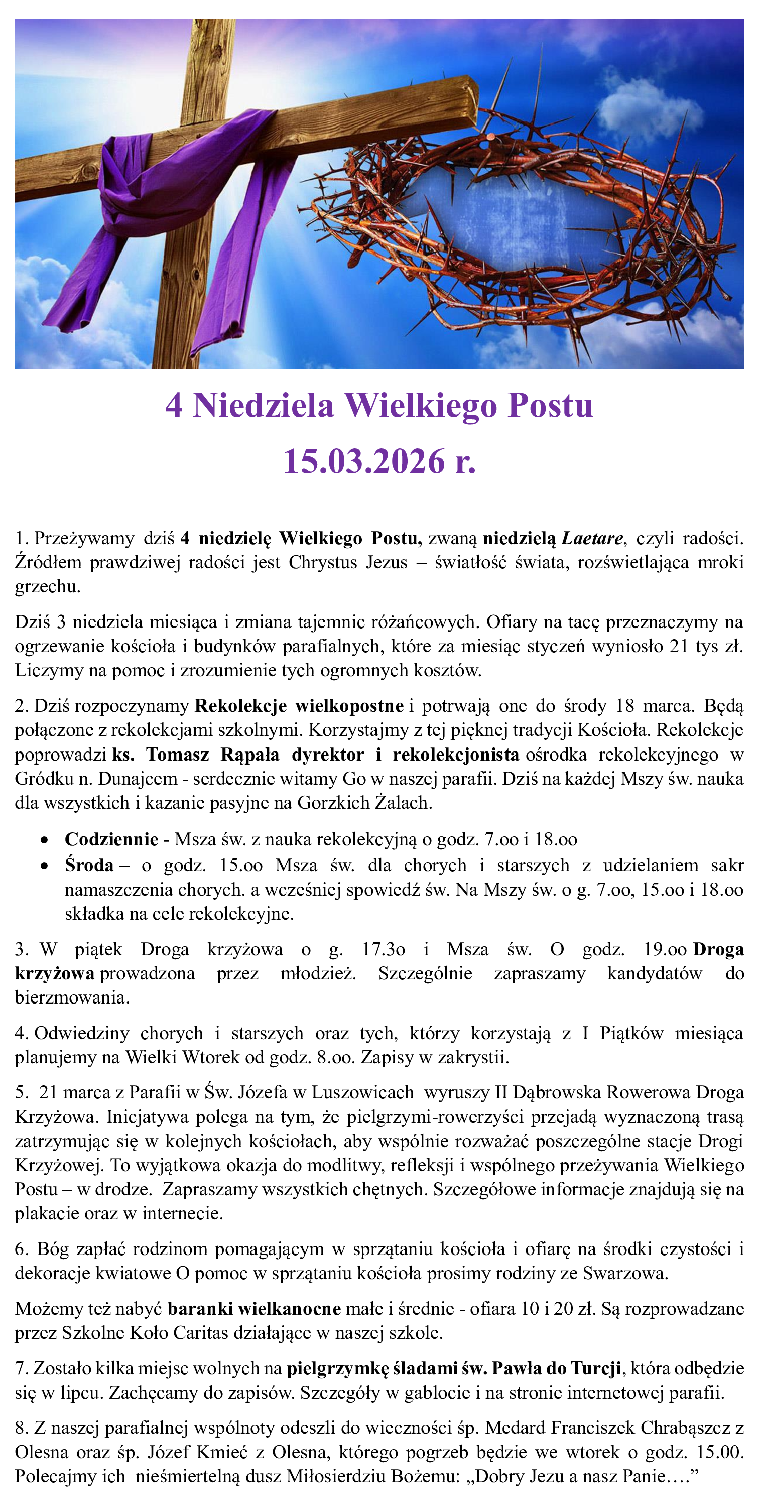 IV Niedziela Wielkiego Postu 15.03.2026 r. Post author:x. Jacek Post published:13.03.2026 Post category:Ogłoszenia