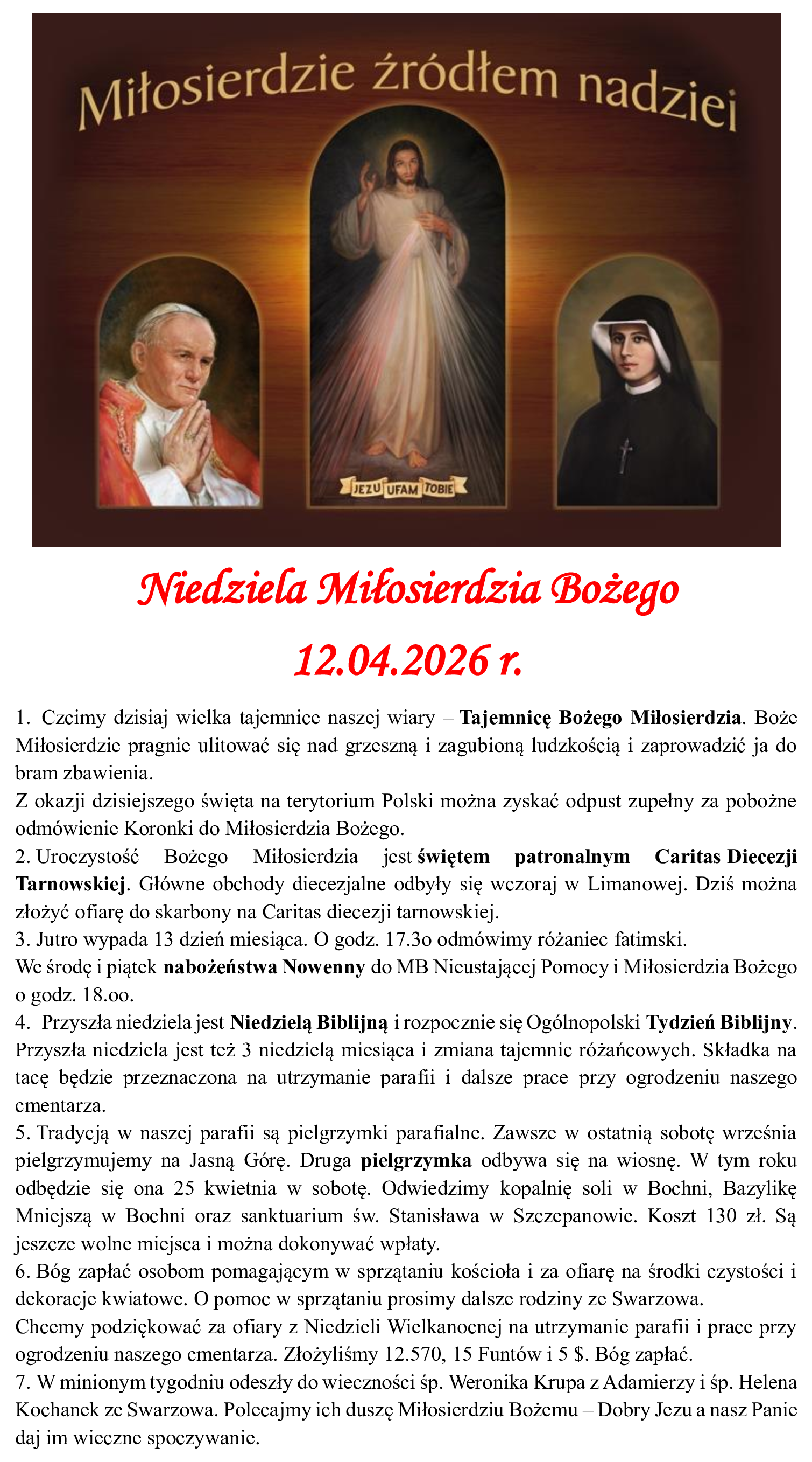 Niedziela Miłosierdzia Bożego 12.04.2026 r. Post author:x. Jacek Post published:10.04.2026 Post category:Ogłoszenia